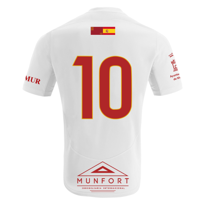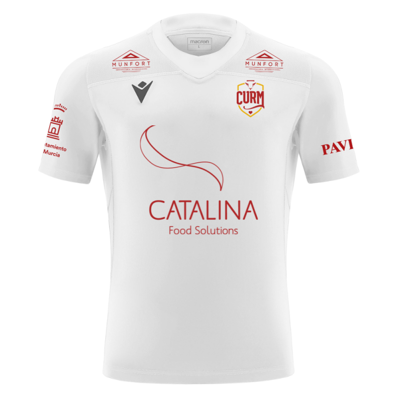Camiseta de juego blanca Macron PERIDOT con Escudo del CURM y Sponsors. 100% Poliéster